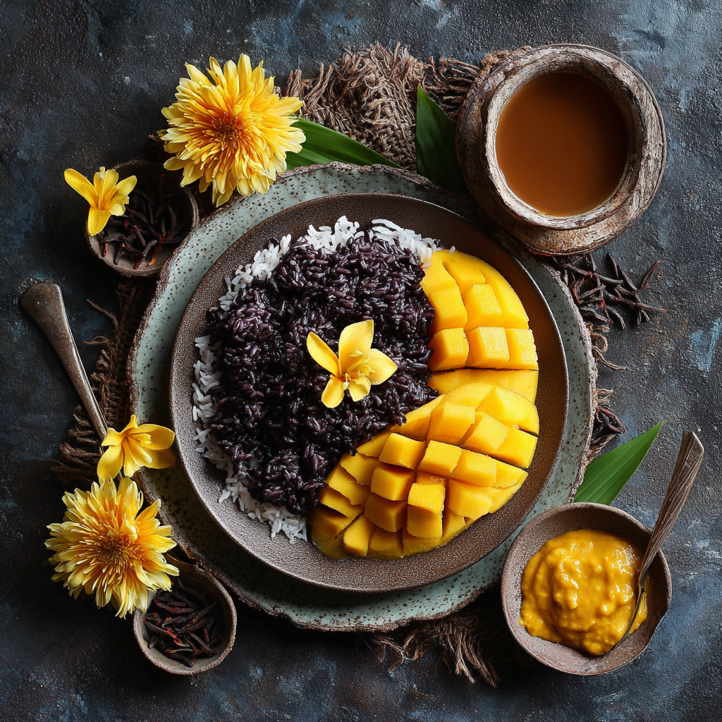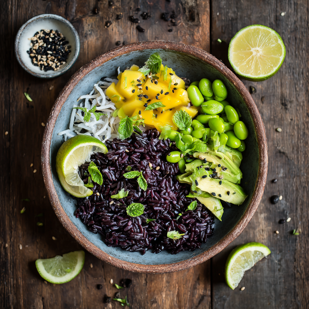 Envie de douceur et d’évasion ? Testez cette variante du célèbre mango sticky rice, mais avec du riz noir pour un dessert à la fois gourmand et nutritif.