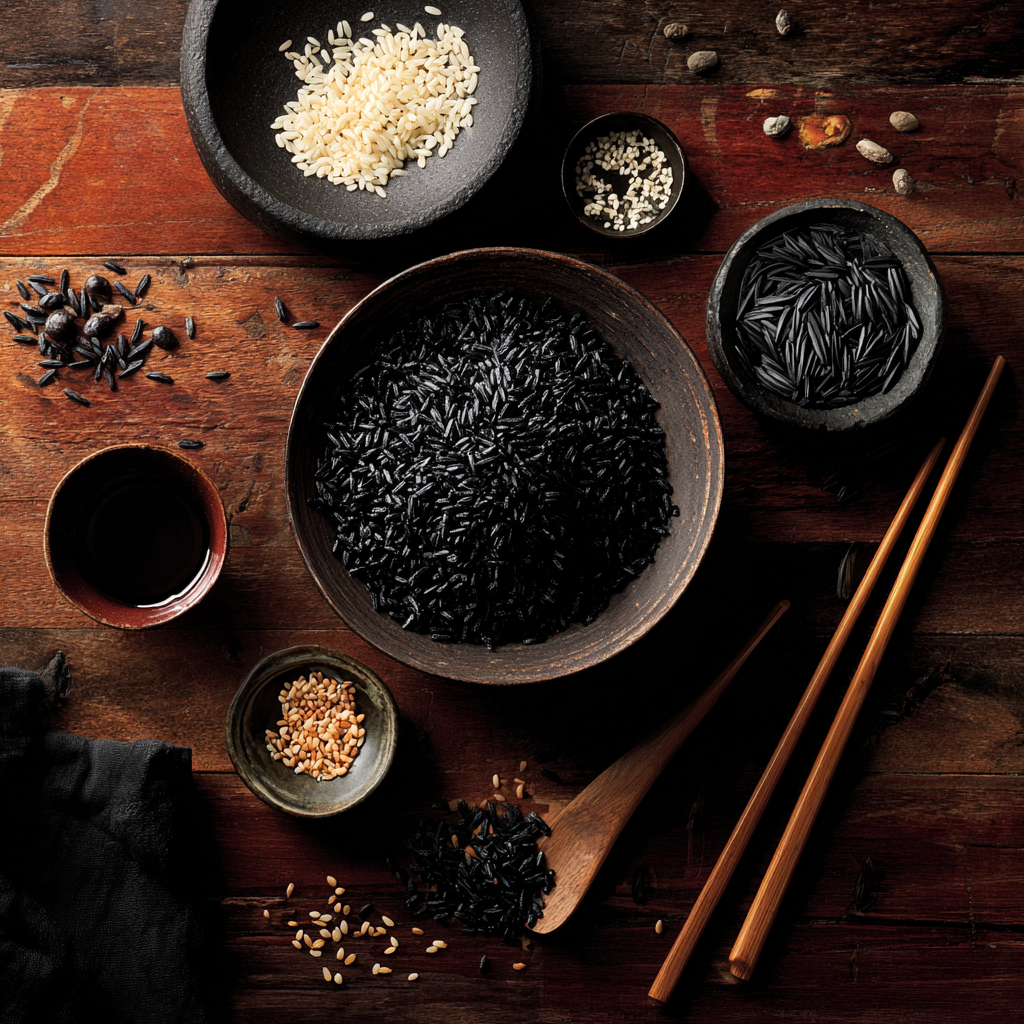 Le riz noir est un riz complet, non raffiné, plus riche en nutriments et en fibres que le riz blanc. Il a un goût plus prononcé, une texture plus ferme, et une couleur naturellement pourpre à la cuisson.