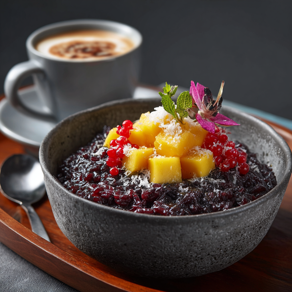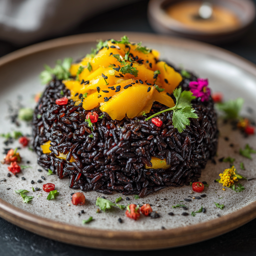 Ah, le riz gluant noir… Un cousin un peu à part, souvent utilisé dans les desserts ou les préparations sucrées-salées d’inspiration asiatique. Son grain est plus court, sa texture plus collante, et sa cuisson demande un peu plus d’attention. Mais le jeu en vaut vraiment la chandelle.