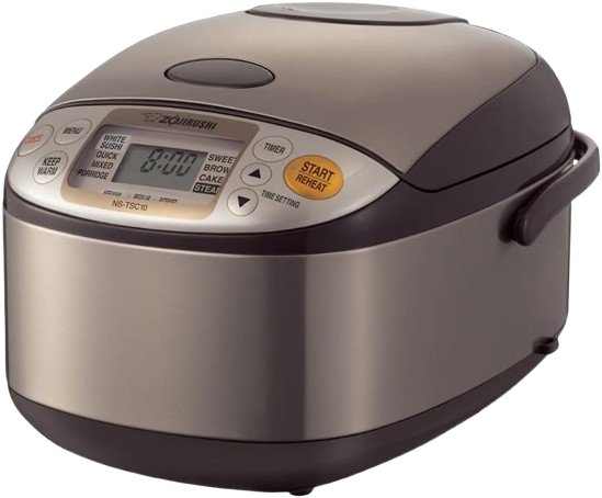 | Zojirushi NS-TSC10 | 1,0 L (5,5 tasses) | 2–5 | ~610 W | Riz blanc, brun, mixte, sucré, gâteau, porridge, vapeur | Cuisson rapide, maintien au chaud, réchauffage, minuterie différée, cordon rétractable | 384,84 |