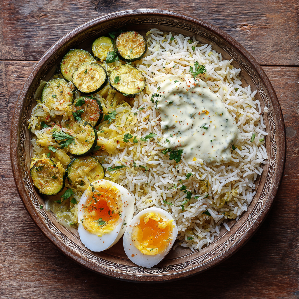 Exemple de dîner léger : 🌙 Riz basmati complet + courgettes poêlées + œuf mollet + sauce yaourt-citron