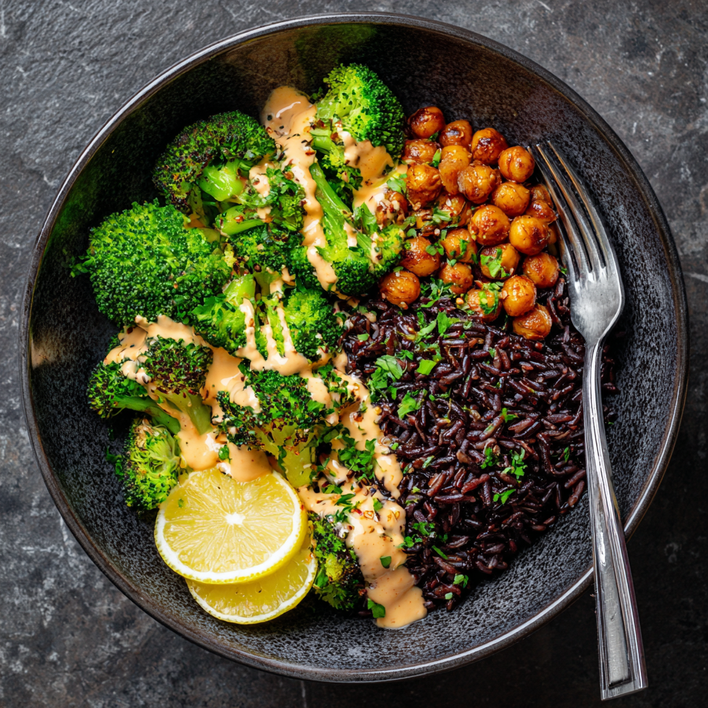 En combinant IG bas + fibres + protéines, vous créez une assiette parfaitement adaptée pour une personne diabétique. Exemple de repas équilibré : 🍽️ Riz noir + pois chiches + brocoli vapeur + sauce tahini au citron