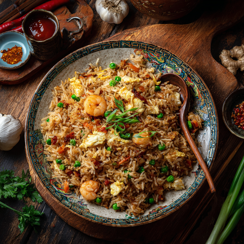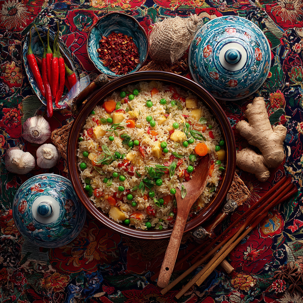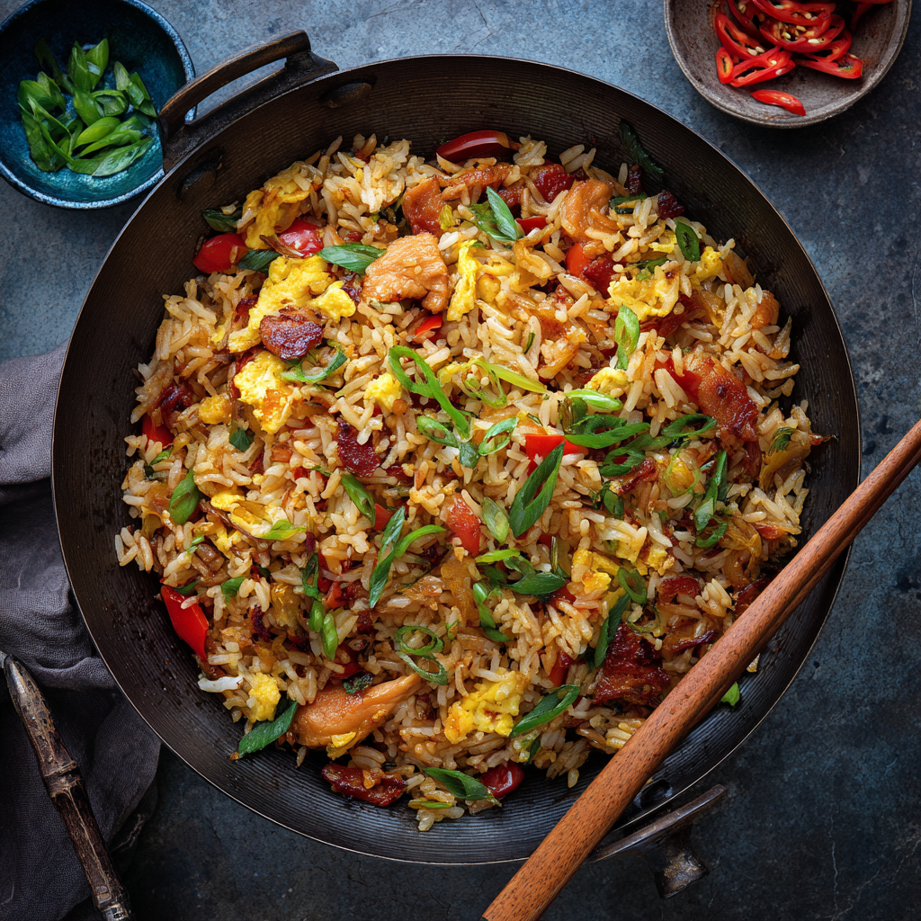 Commencez par faire sauter les œufs brouillés, puis réservez-les. Ajoutez ensuite les légumes et protéines, en respectant les temps de cuisson : les plus coriaces d’abord, les plus tendres en dernier. Incorporez enfin le riz froid en le cassant délicatement à la spatule, par gestes amples et rapides. L’objectif ? Séparer chaque grain, les enrober uniformément de saveurs, sans jamais les écraser.