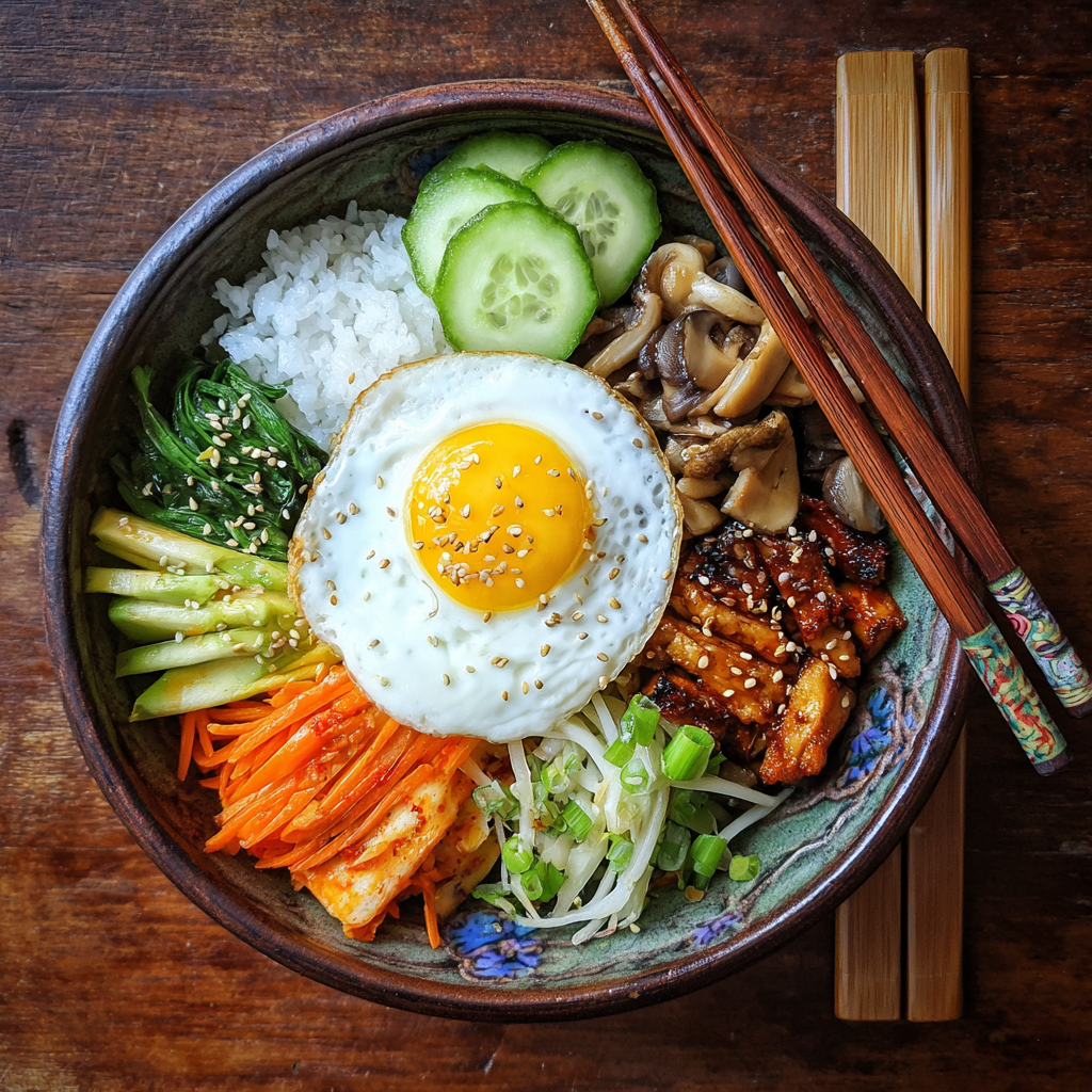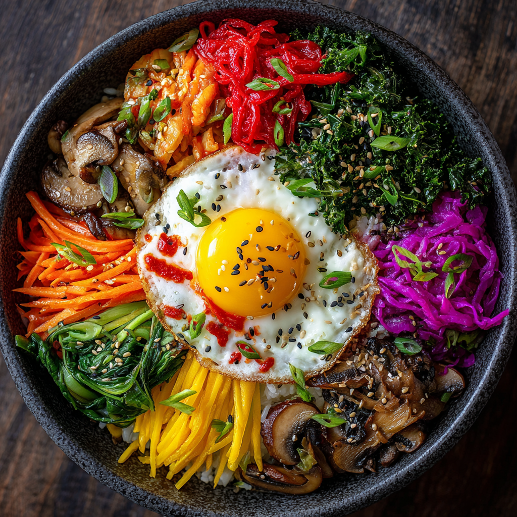 Le principe est simple : un lit de riz chaud, garni de légumes sautés séparément (pour conserver leurs saveurs et couleurs), d’une sauce épicée — souvent à base de gochujang, la fameuse pâte de piment fermenté coréenne —, et d’un œuf (souvent au plat, avec le jaune bien coulant). On y ajoute parfois de la viande, du tofu ou du poisson, selon les goûts.