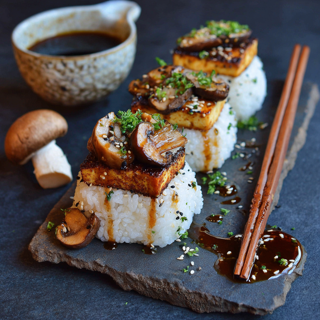 Hiver : onigiri au tofu fumé, champignons et sauce soja sucrée ❄️