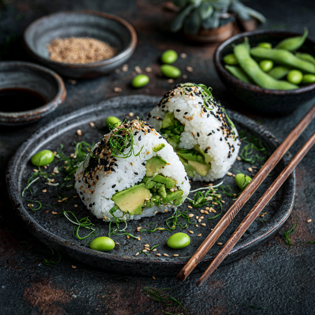 Été : onigiri vegan à l’avocat, edamame et sésame 🌞