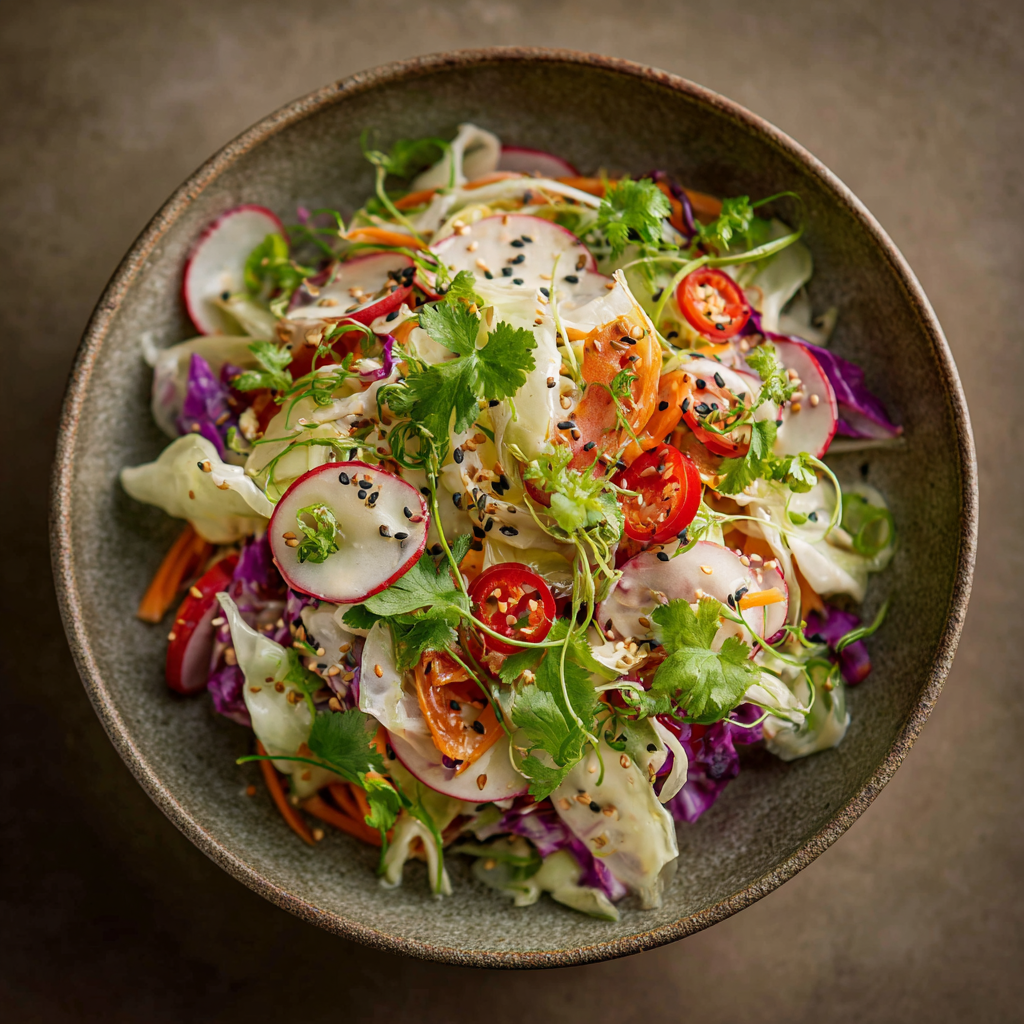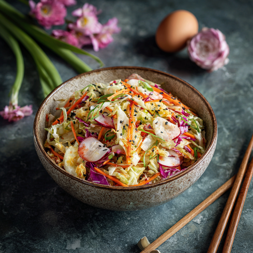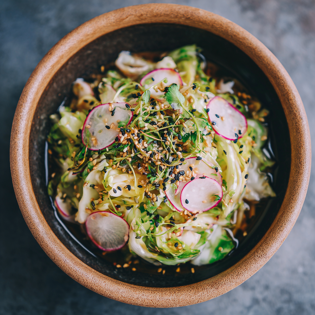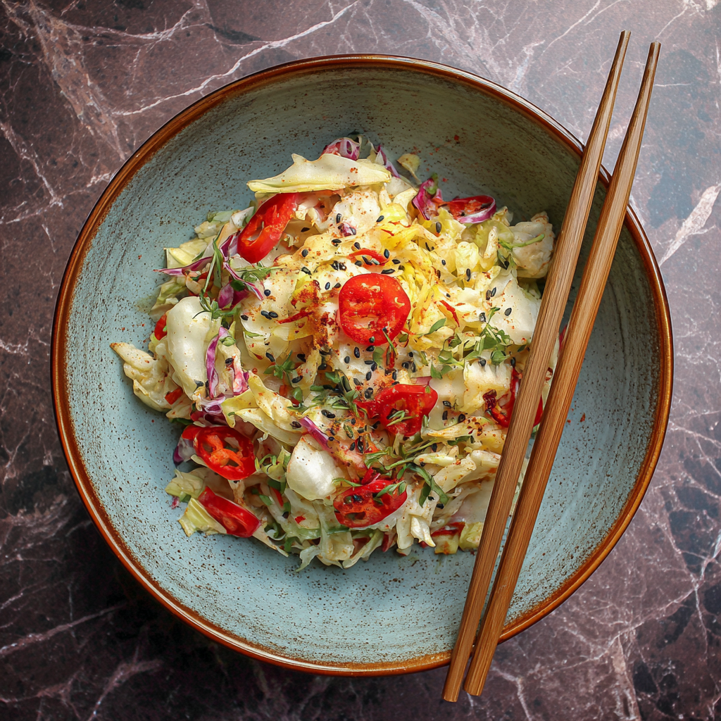 Laissez reposer 5 à 10 minutes avant de servir : ce court temps permet aux saveurs de s’harmoniser sans que le chou ne rende trop d’eau. Résultat ? Une salade éclatante, croquante et visuellement irrésistible qui fait honneur à la cuisine nippone.